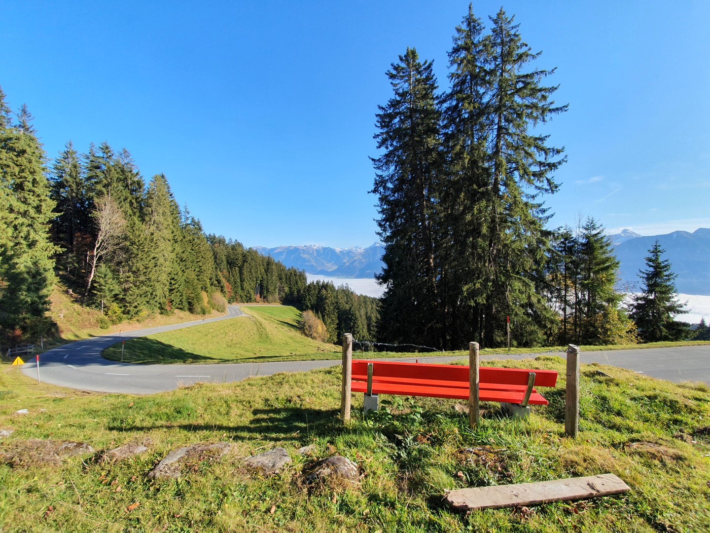Dieses schöne rote Bänklein, hat uns weiter oben eine tolle Aussicht ermöglicht.